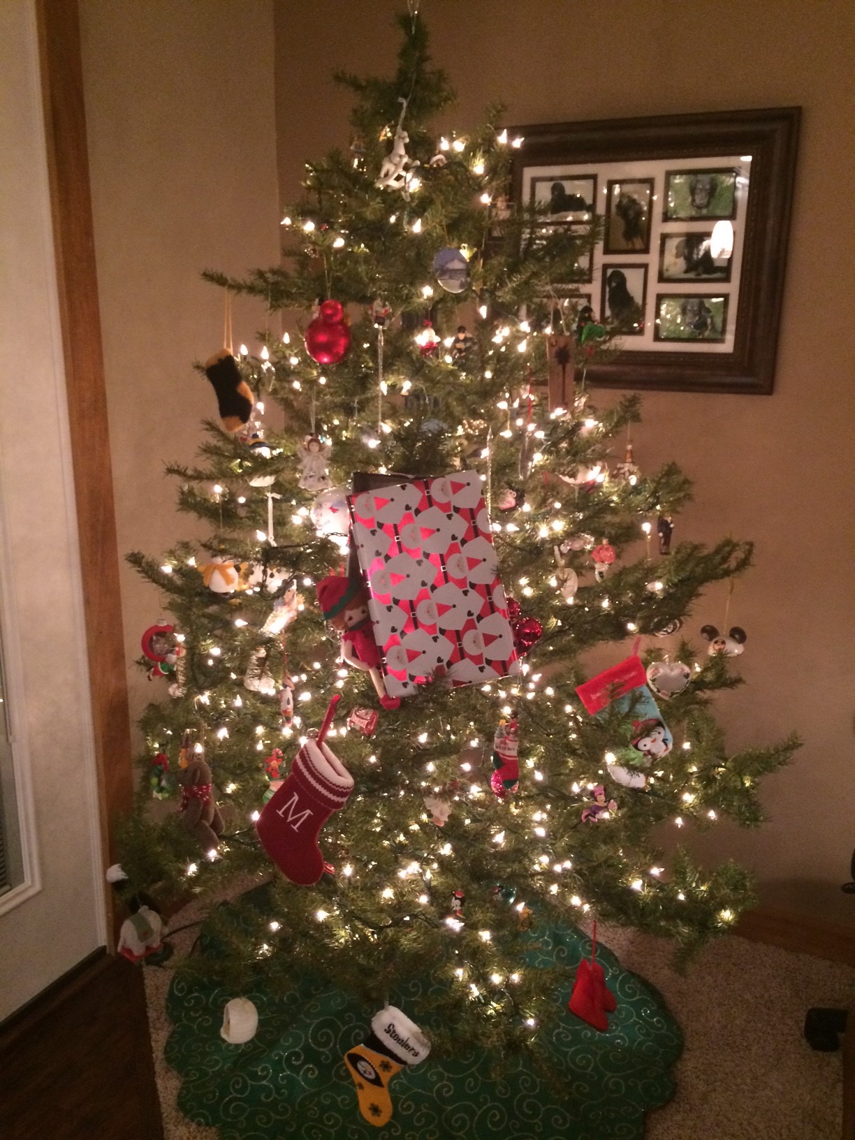“T”houghts-So my goal is to post pics every day of Eva and her adventures. I will do my best to remember and to do on time. I might not have a full blog post every day, but I will try to post pics. Here is arrival day on 11/28/2014, just hanging out in her box (that I wrapped so I can reuse each year) on our tree (or as M calls it, Ho Ho’s tree):